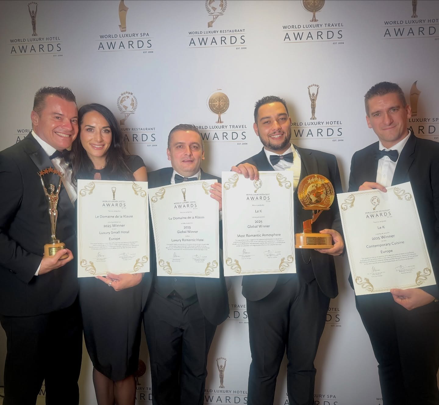 Il repart avec les prix d'hôtel le plus romantique du monde, celui de l'atmosphère la plus romantique, celui du meilleur petit hôtel de luxe en Europe et de Meilleure cuisine contemporaine d'Europe !