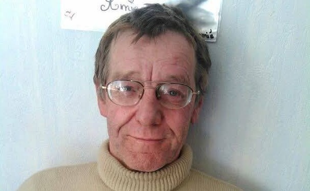 L’homme a les cheveux mi-longs de couleur gris et une légère barbe.